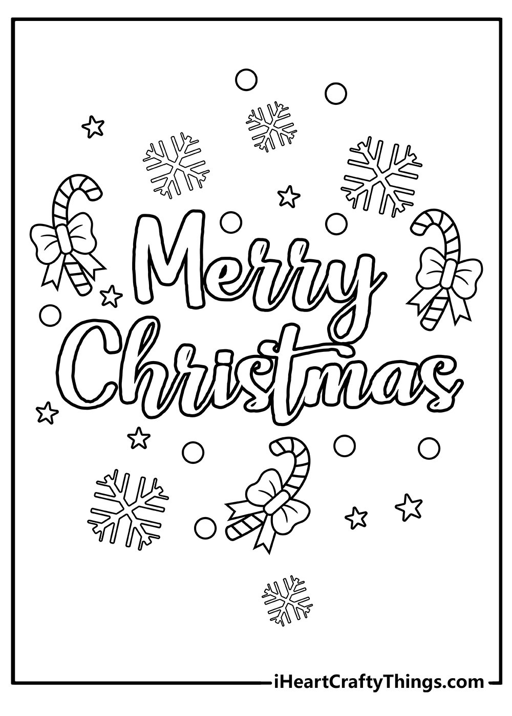 This page features the “Merry Christmas” message and plenty of cute wintery design details like snowflakes, stars, and delicious-looking candy canes.