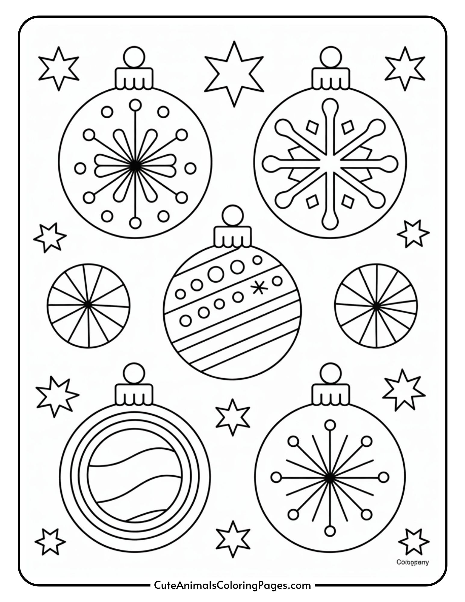 A black and white color page featuring six decorative Christmas ornaments, each in a different pattern, surrounded by small stars. The decoration includes designs such as snowflakes, dots, stripes and stripes.A black and white color page featuring six decorative Christmas ornaments, each in a different pattern, surrounded by small stars. The decoration includes designs such as snowflakes, dots, stripes and stripes.Needle